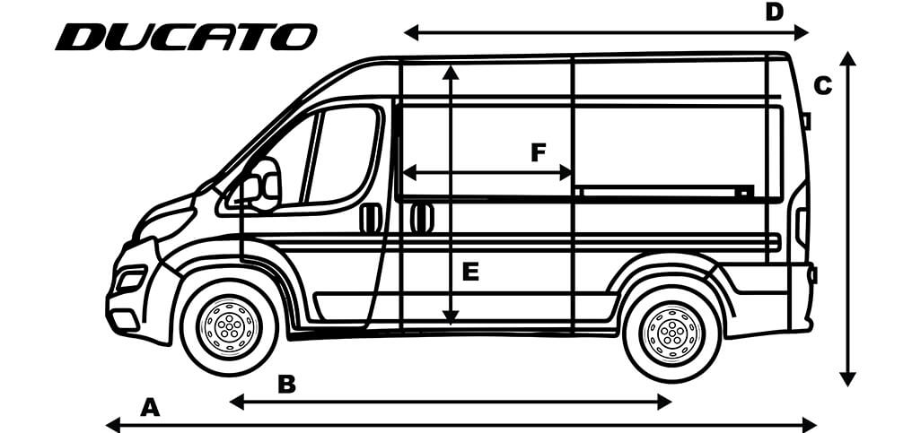 A - celková délka, B - rozvor náprav, C - celková výška, D - délka nákladový prostor, E - výška posuvných dveří, F - šířka posuvných dveří